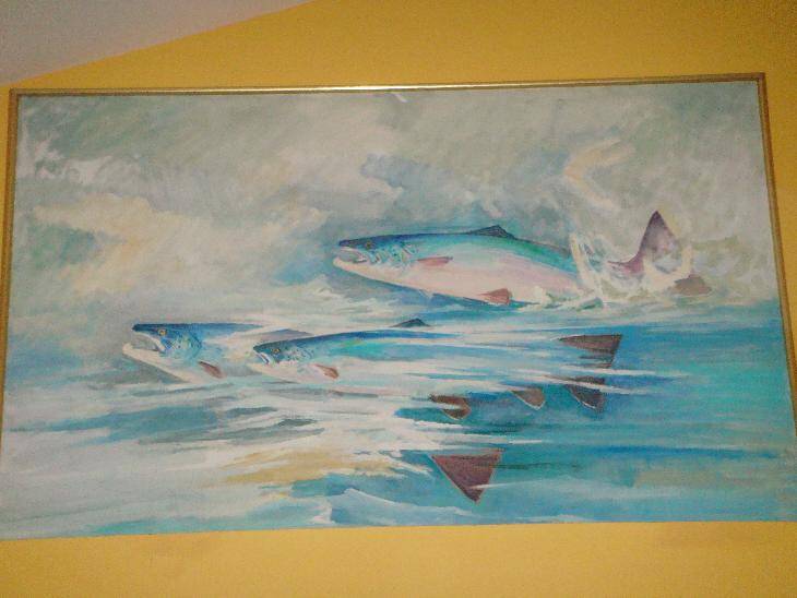 Toen hij het allemaal eens goed bekeek, zag hij dat het hier niet ging om een aquarium maar dat er ruiten waren geplaatst in de betonnen kelderwand. Het museum stond namelijk gedeeltelijk in de rivier de Laerdalselva en de wilde zalmen die hij hier zag waren in de rivier middels een ingenieus systeem gescheiden en zwommen nu voor deze ruiten. Hij werd steeds stiller van al het moois wat hij zag. Ook de afdeling van "the English Salmon Lords" en de binddemonstraties gingen er in als Gods woord in een ouderling. Plotseling herinnerde zijn vrouw hem eraan dat ze hier nu al twee uur rondhingen en dat ze onderhand verder moesten. "Nog even het museumwinkeltje in en dan gaan we" zei hij. Hij keek daar rond en werd prettig verrast door de schoonheid van een litho waarop drie opspringende zalmen staan afgebeeld. Toen hij deze ging afrekenen en nog kort een praatje maakte met de verkoper, vertelde deze hem dat het toegangsbewijs van het museum tevens ook een dagvergunning is voor het vissen op de Laerdalselva nabij het museum.